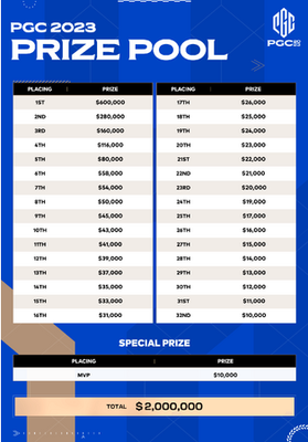 PGC 2023の賞金総額は基本賞金200万ドル(約3億円)にPGC 2023アイテム販売収益の25%が追加され、さらに増えるクラウドファンディング方式を採用しています。